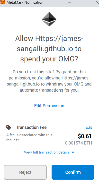 4. Use the Find feature through your browser to paste in and search for the address you want to revoke. To make things simple, I’ll simply revoke the first address depicted above, which is tied to OmiseGo’s OMG token. When I click “Revoke,” I’m prompted to send a revoke transaction, which looks like this: