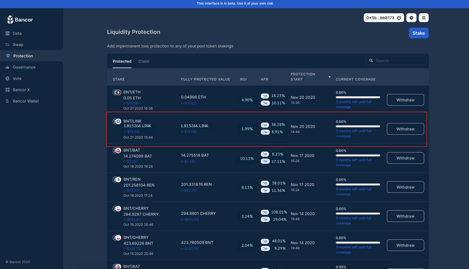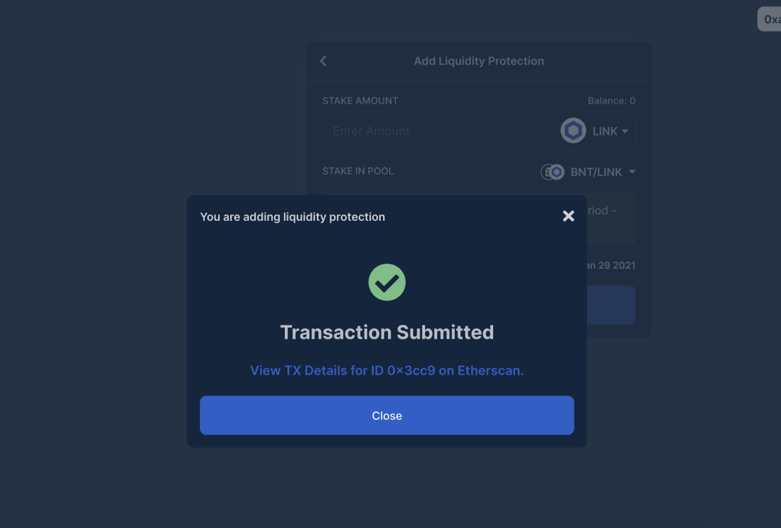 And that’s it! Once the transaction confirms, your protected single-sided liquidity stake should now appear in the Protection screen. If it doesn’t, click refresh!