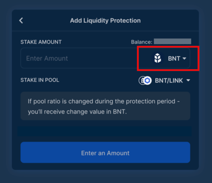 Step 3: Select if you want 100% exposure to the ERC20 token (in this case, LINK) or BNT. Click the dropdown menu to toggle between BNT and LINK. Input the amount of tokens you wish to provide. Clicking “Balance” will select the full balance.