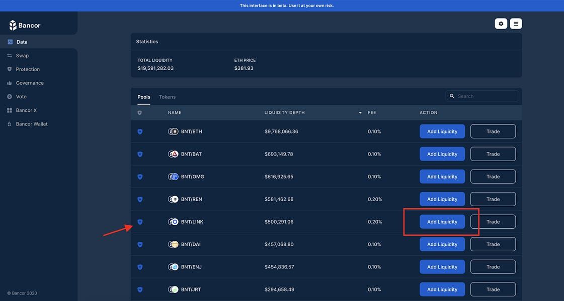 ❗Note: Bancor v2.1 recently went live and the screens below are evolving, with new features and additional data being added in the coming days and weeks.