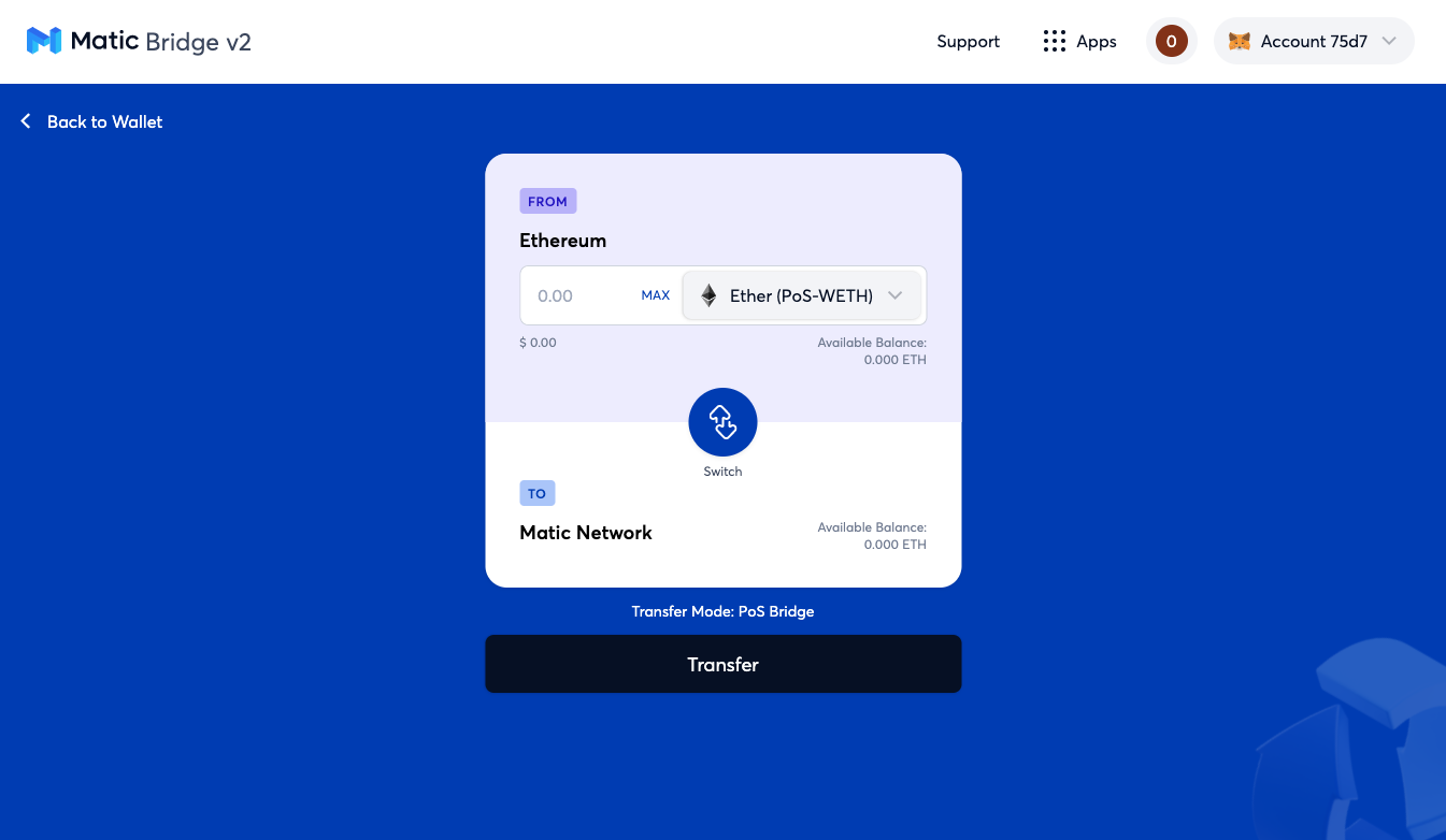 You should see “Transfer Mode: PoS bridge” just above the black Transfer button, if not please set it to “PoS bridge”.