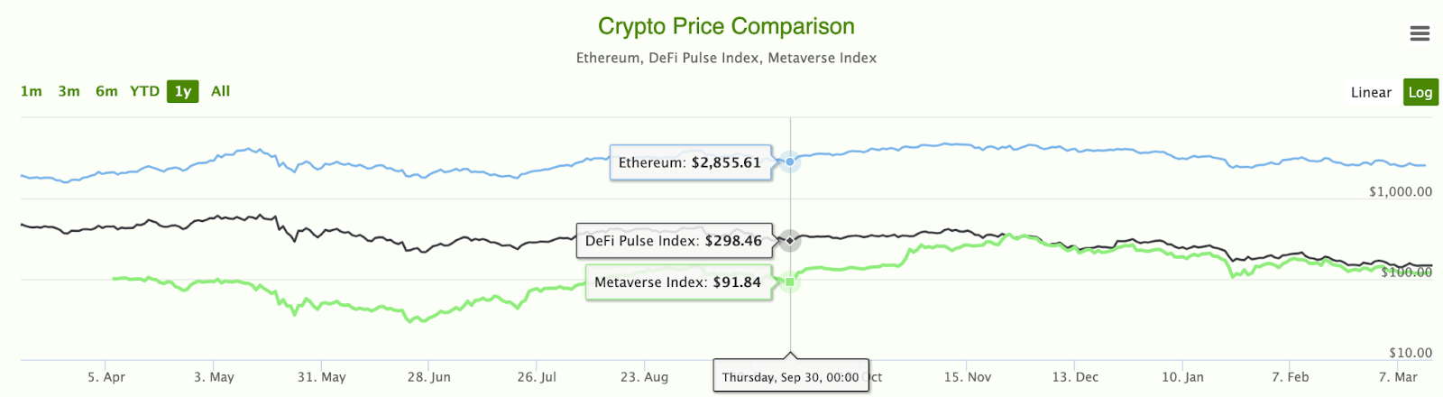 In all types of markets, some sectors will outperform others. For example, when comparing MVI, DPI, and ETH, we can see that ETH performed better in the long term. In other periods like September to December, MVI came out ahead of ETH and DPI:
