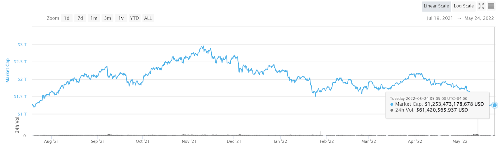 A quick look at the market shows we’re far, far down from ATHs. According to CMC, crypto’s market cap peaked back in early November at just under $3T. As of writing, crypto sits at roughly $1.25T. That’s a 58% fall over the span of 7 months. Even after accounting for crypto’s volatility, we’re still looking at three times the drawdown from the 20% heuristic.