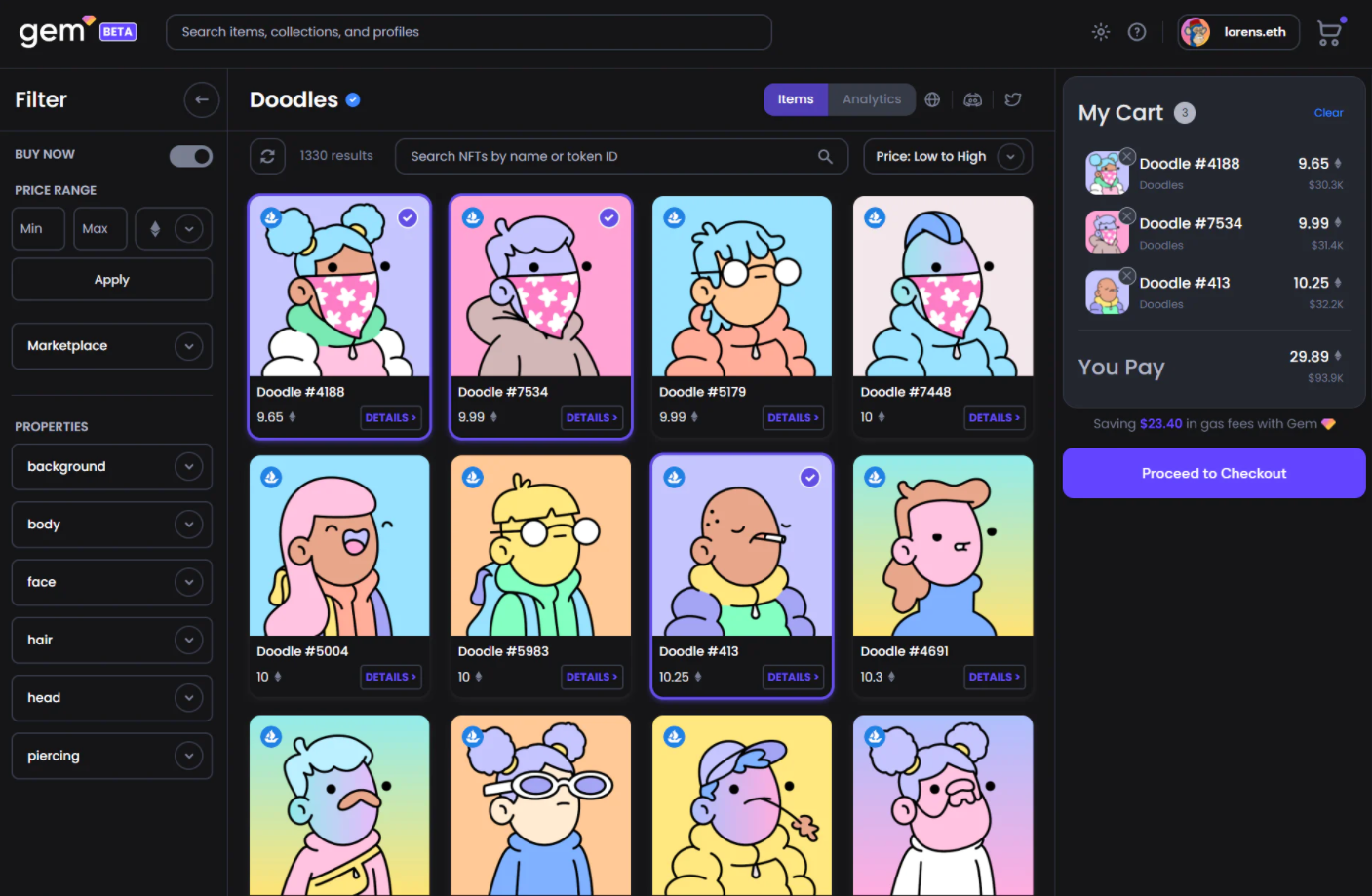 - This will bring you to the NFT collectionâs dedicated Gem dashboard. Use the UI to fill up your shopping cart with the pieces you want.