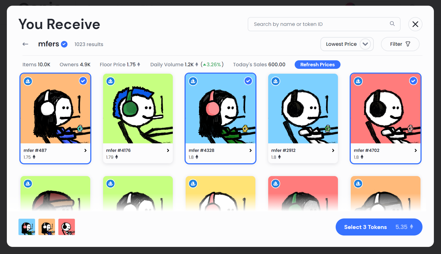 - Search through the collection and click on the NFTs you want to purchase. When youâre ready, press the âSelect # Tokensâ button.