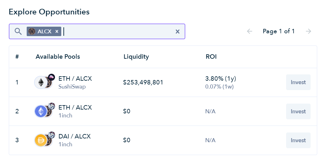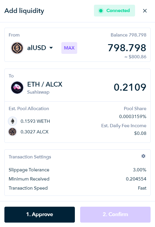 For this strategy, deposit DAI and max mint alUSD in Alchemix. Then go to Zapper.fi and connect your wallet. Navigate to the “Pool” tab and search for ALCX and select the ETH/ALCX pool. You can then take your borrowed alUSD and convert it to Alchemix’s high APY farm tokens, ALCX/ETH SLP, which is currently earning ~280% APY.