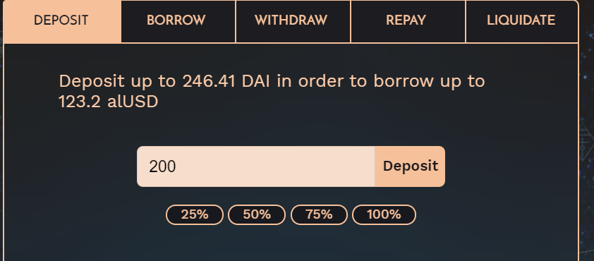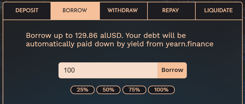 The protocol allows you to borrow up to half the amount of DAI you deposit. For example, depositing 1000 DAI allows you to borrow up to 500 alUSD. The DAI you deposit is then put to work earning yield in Yearn—to repay your alUSD debt gradually over time.