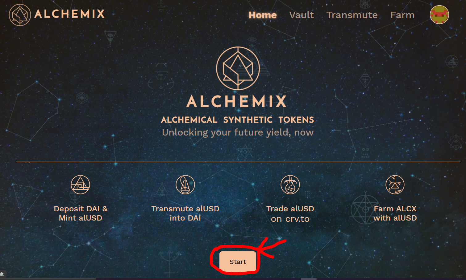- Go to https://app.alchemix.fi/ and click on the Start button.