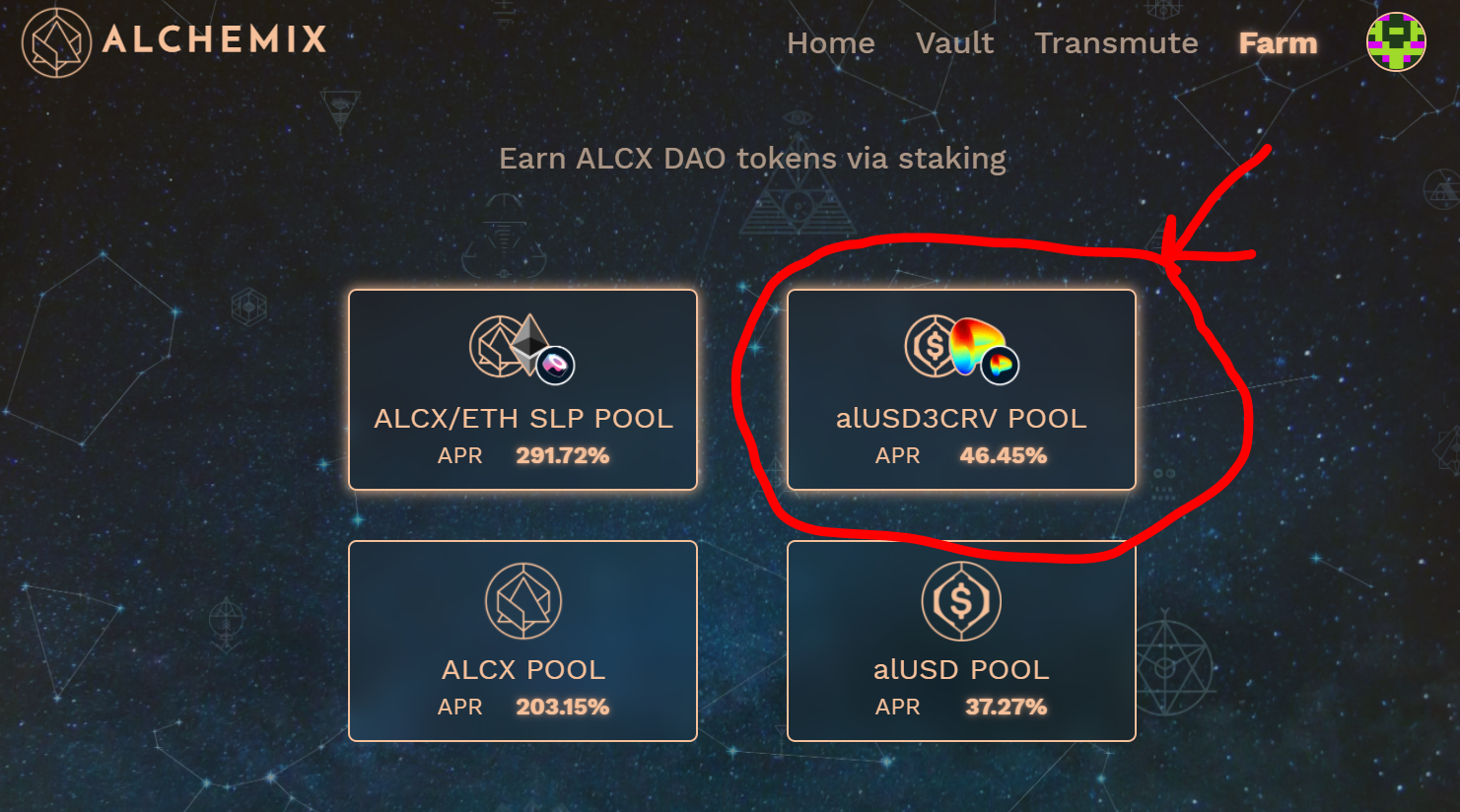 The first option is staking alUSD in the Alchemix Farm to earn ALCX. Simply stake your minted alUSD into the alUSD pool on the “Farm” page of the app. ALCX rewards will accrue over time and can be claimed anytime.