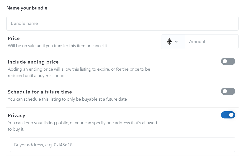 - Input the negotiated ETH portion of the deal, confirm the listing, and then send the URL over to your friend. They can buy via the link, and then repeat this same process on their end and send you a bundle URL in kind.