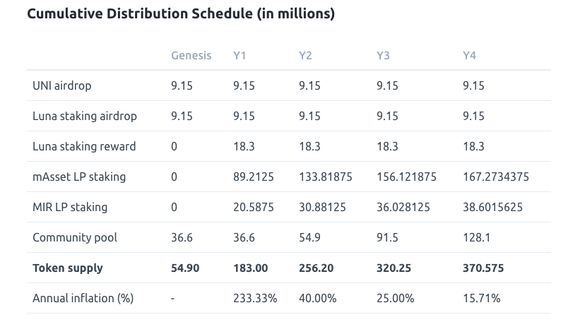 The distribution of the MIR token (including liquidity provision allocations) is in the screenshot below.