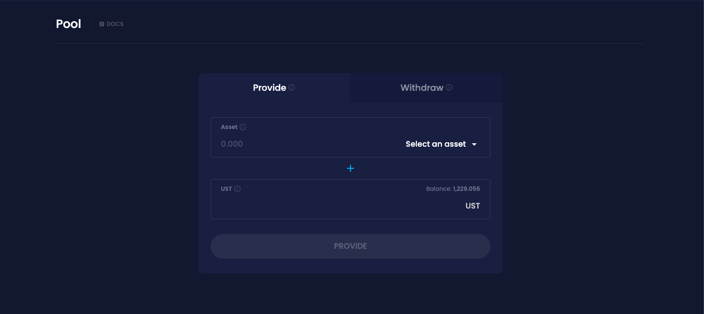 On Terra, go to the “Pool” page and deposit the corresponding amount of UST/mAssets to earn LP tokens.