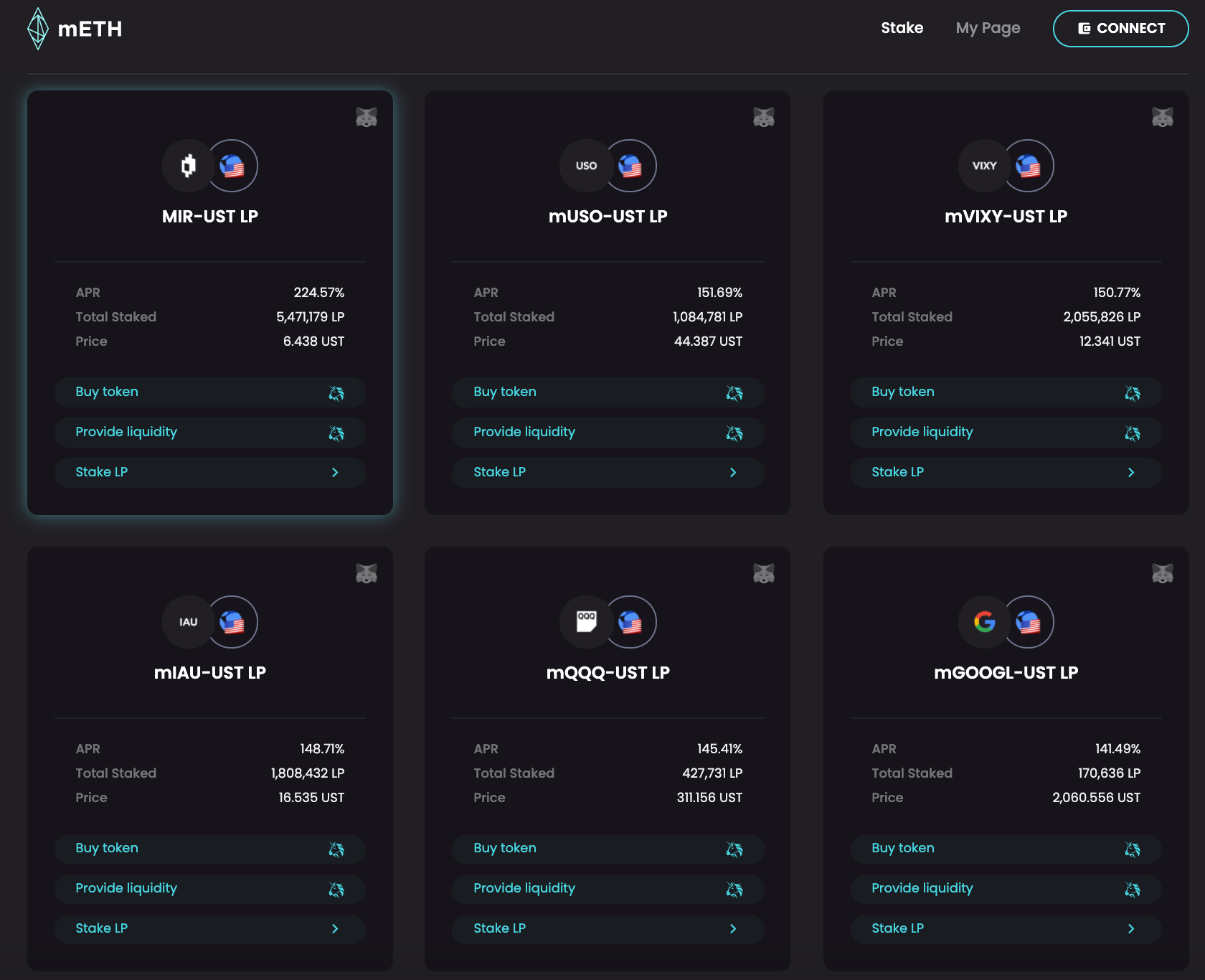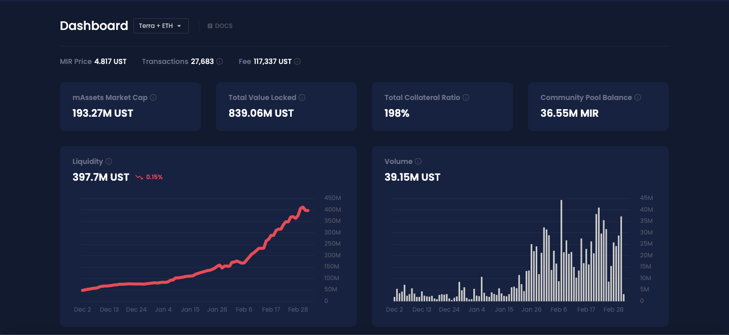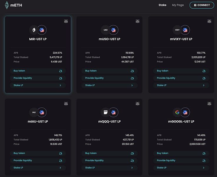 As mentioned, mAssets can be traded on Mirror-compatible networks like Terra, Ethereum, and Binance Chain. Liquidity providers of UST-mAsset pairs are rewarded handsomely in MIR tokens for liquidity provision on both Terra and Ethereum, with real-time APRs for staking LP tokens available for Ethereum here and Terra here.