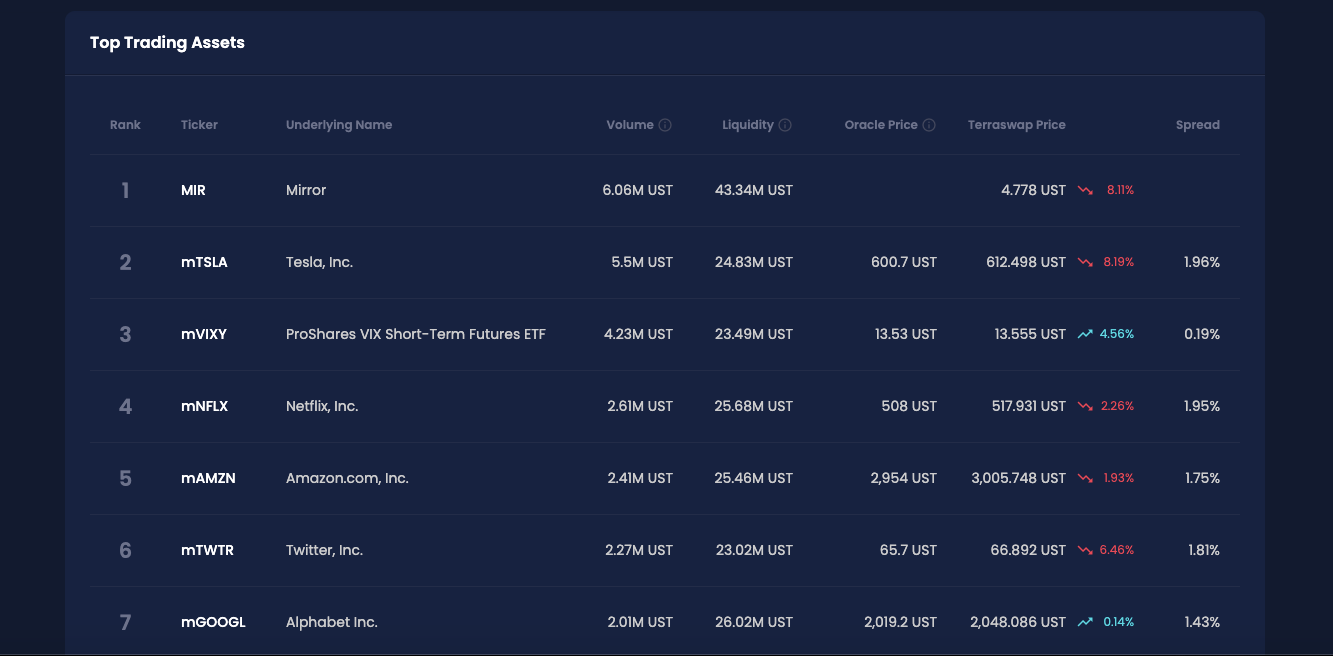 That’s what’s interesting about Mirror Protocol. They’re building a synthetic asset protocol that supports major U.S. equities like AMZN, AAPL, and TSLA.