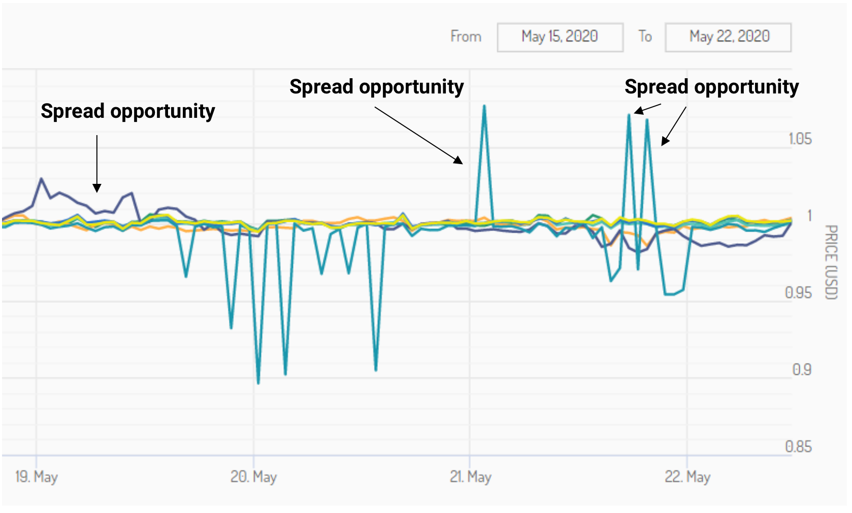 Each of the spots where the lines are over $1.00 were opportunities to sell stablecoins at a spread using the Gnosis protocol and earn profits. This tactic will show you how.