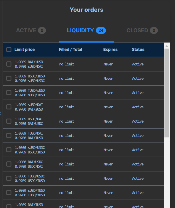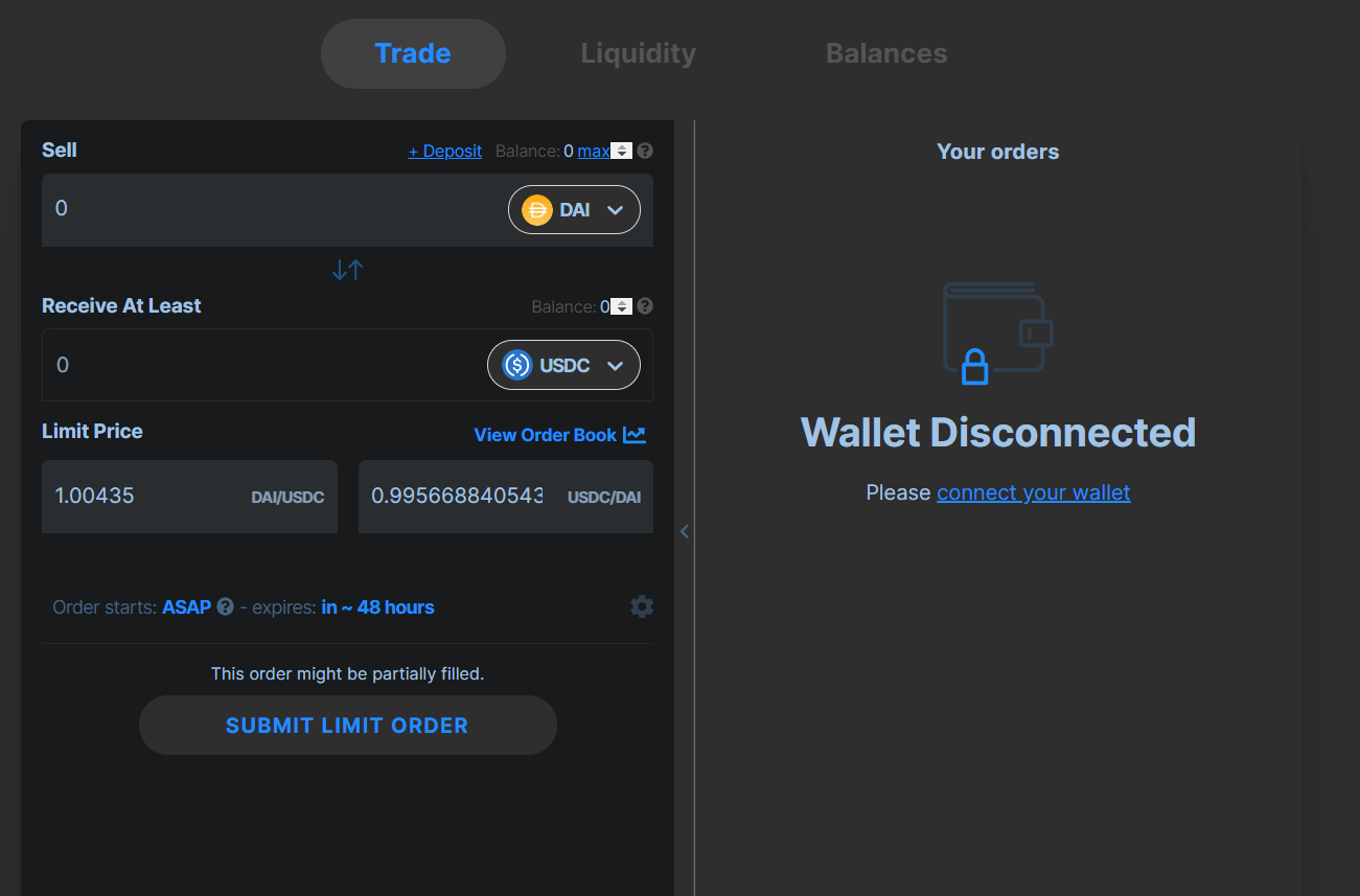 Liquidity Orders allow users to set a spread at which they are willing to sell their stablecoins for other stablecoins (i.e., 0.3% spread to always sell 100 DAI for 100.3 USDt, or buy 100 USDt for 99.7 DAI). This is predicated on the assumption that your stablecoin is always worth at least $1.00. A liquidity order costs a one-time gas fee but after it you can simply sit back and observe your order’s progress. 🏖️