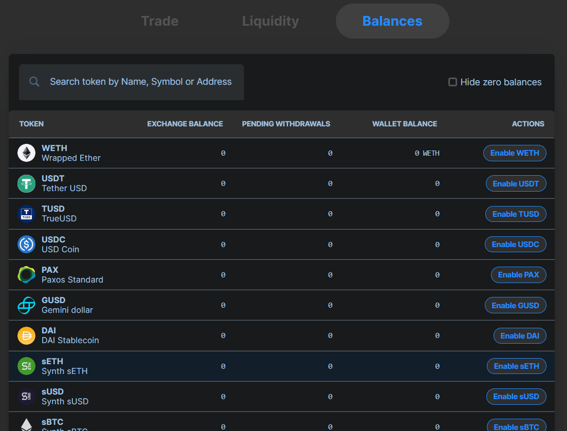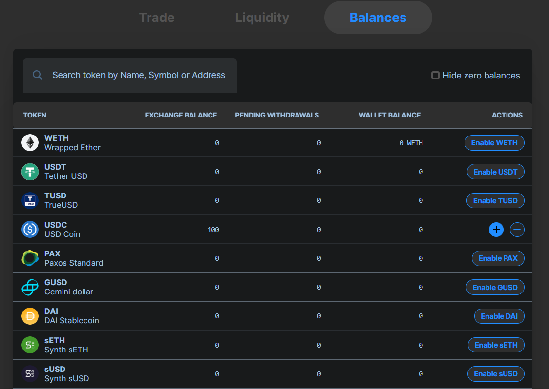 To load wallet funds into the exchange platform, click Enable, corresponding with the stablecoins you wish to deposit for your Liquidity Order.