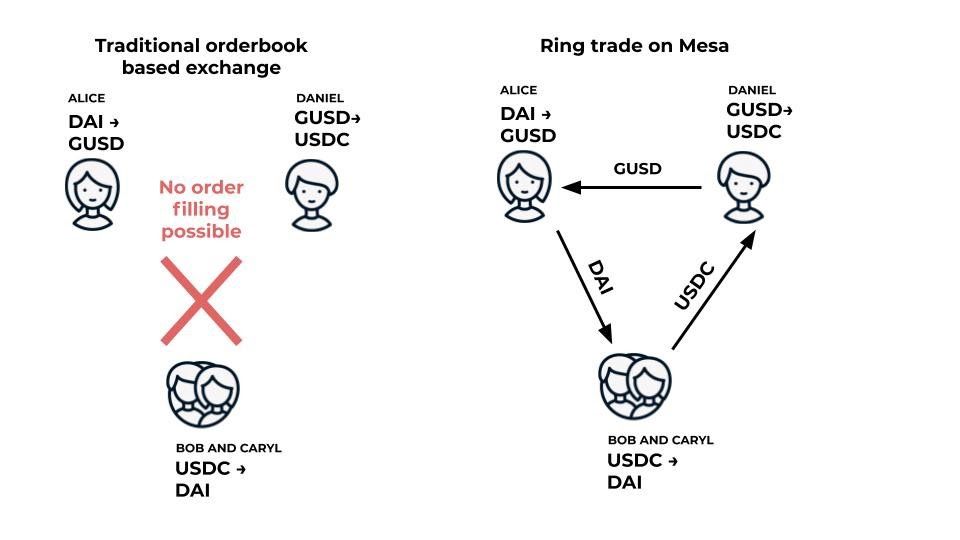 The Gnosis Protocol enables trading platforms to execute “ring trades”, which can match three or more people trading multiple assets. Detailed in the image below, this allows their orders to be fulfilled simultaneously when they would not have been able to otherwise.