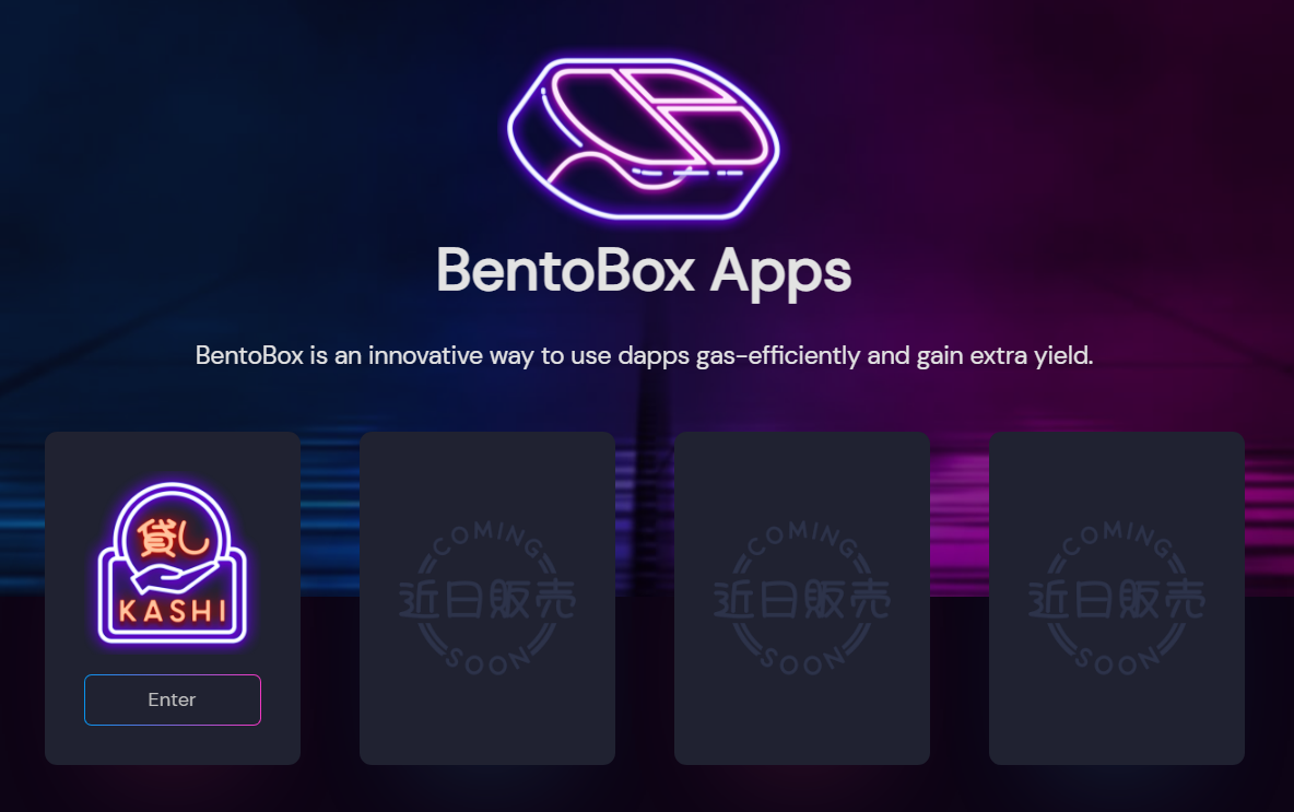Kashi, which means lending in Japanese, is the first app built atop the BentoBox system. The lending service lets users create and customize their own decentralized borrowing and lending markets, with each of these markets isolated from one another.