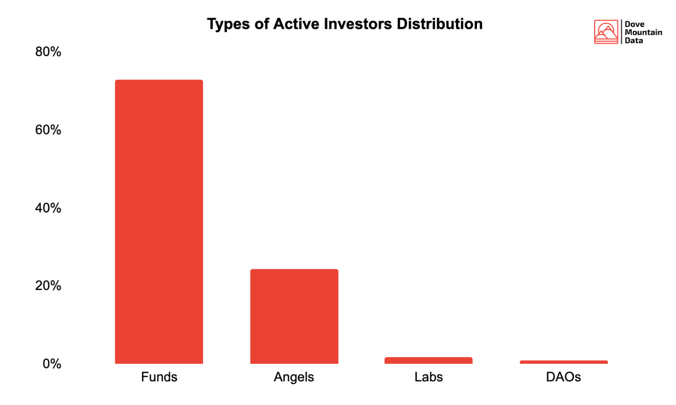 Before diving into the other types of investors, let’s have a look at country distributions. The US is clearly dominant from a capital perspective, holding nearly half of funds actively investing in DeFi. Singapore and China are two fast-emerging DeFi fundraising hubs, with Europe behind.