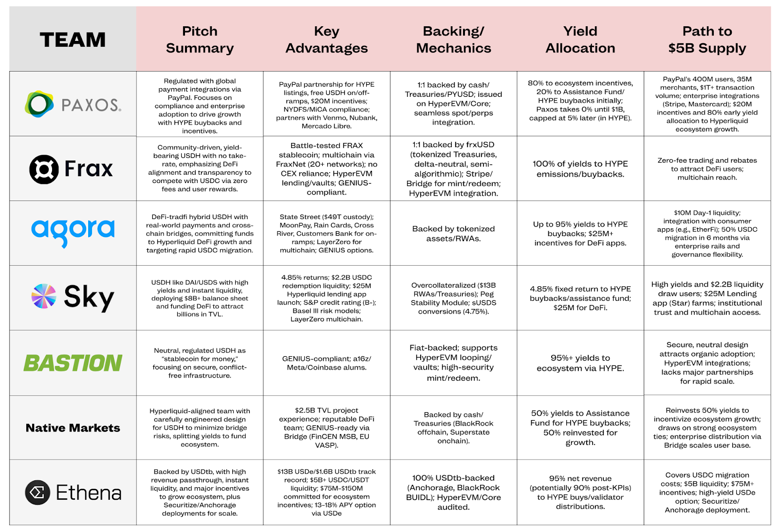 While all these proposals bring something to the table, typically some mixture of revenue share and regulatory readiness, three in particular stand out when evaluated against Hyperliquid's stated criteria for a "Hyperliquid-first, Hyperliquid-aligned, compliant, and natively minted USD stablecoin."