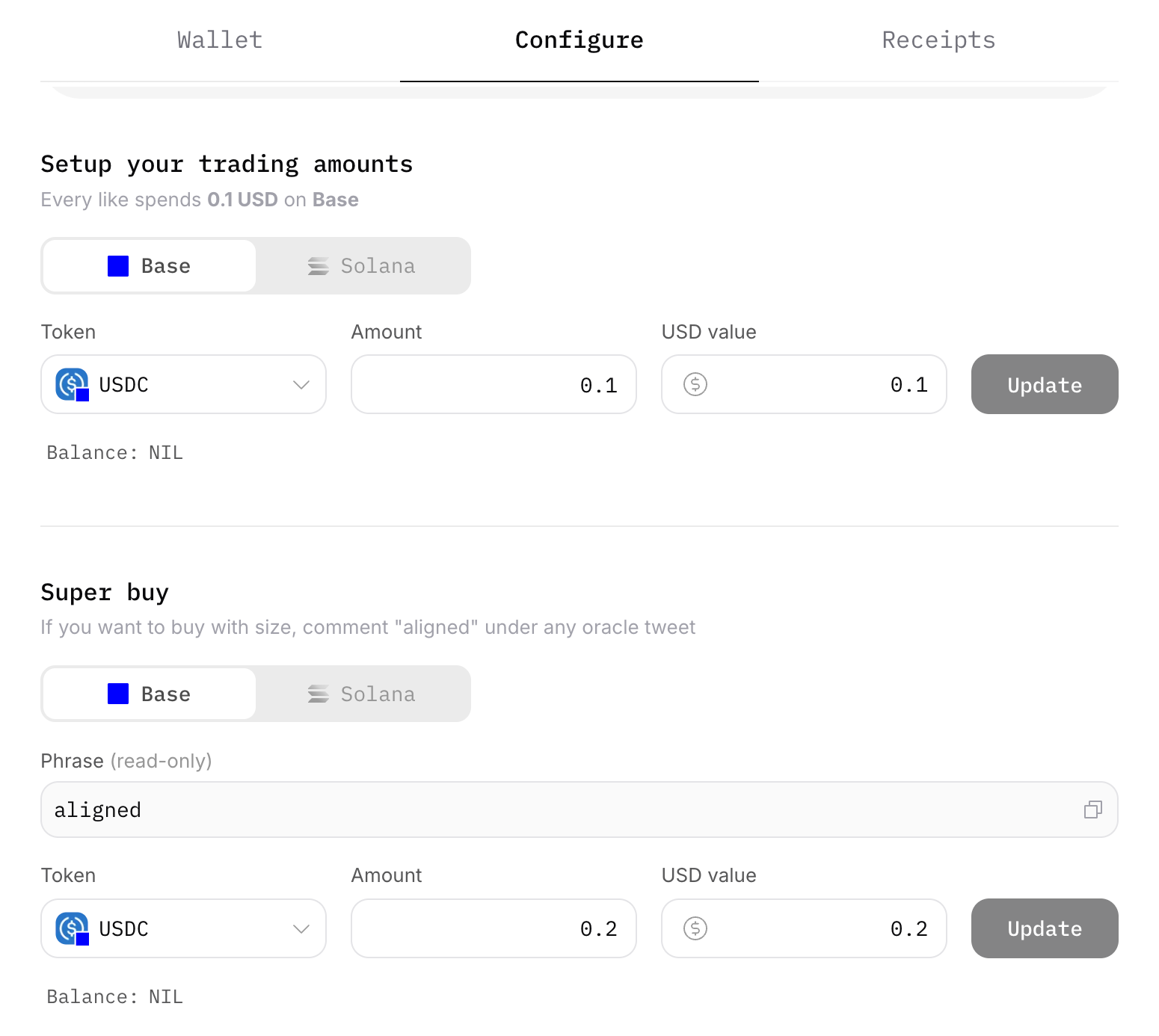 There are two types of buys, meant to be a way to determine the size of your bids: regular spends, triggered by liking tweets, and super aligned buys, triggered by commenting “aligned” under an Oracle tweet.