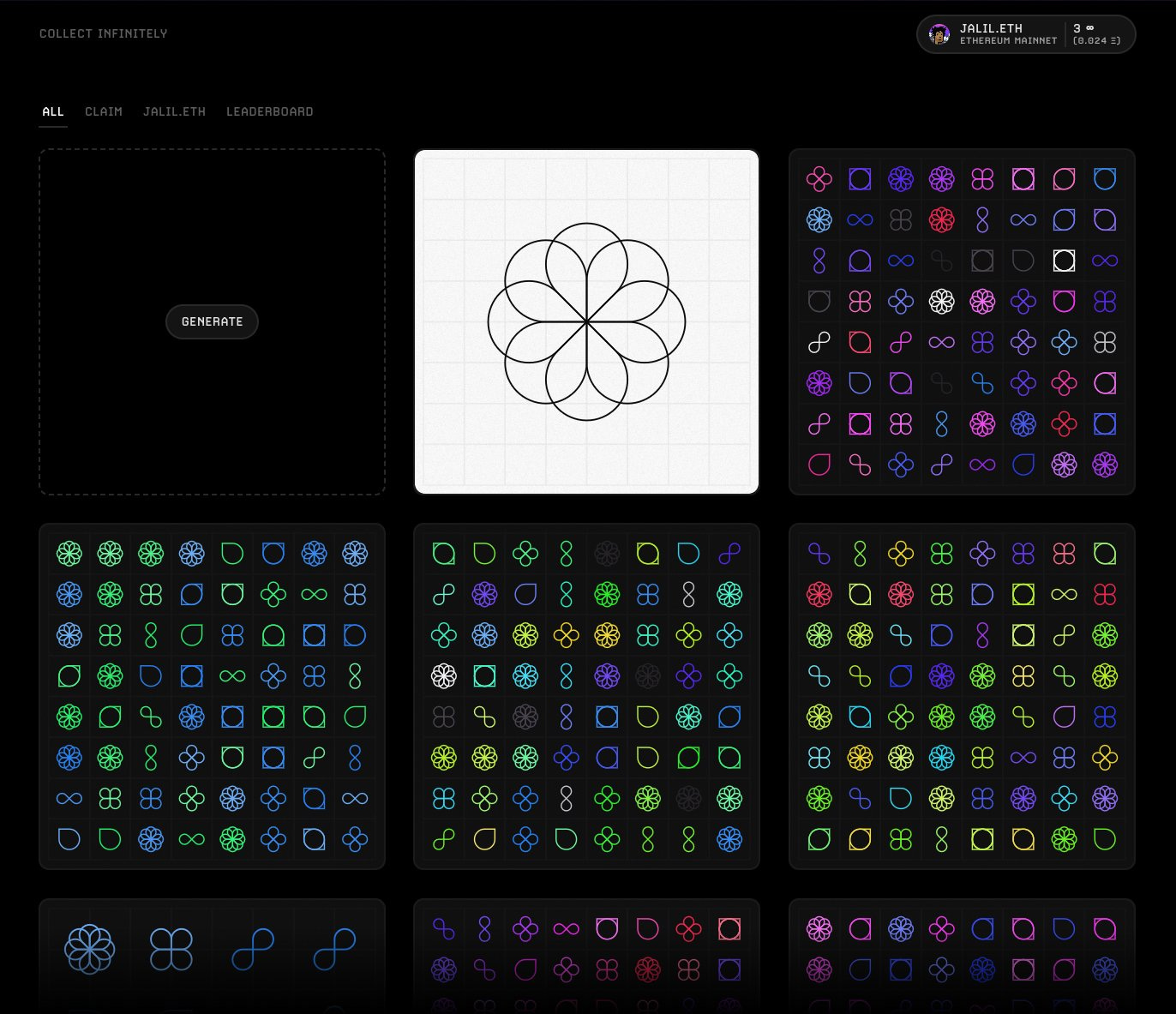 Introduced by jalil.eth on August 7th, 2023, the Infinity collection is an experimental cryptoart project designed to facilitate the creation of “infinite editions” with an “infinite supply of each piece.”