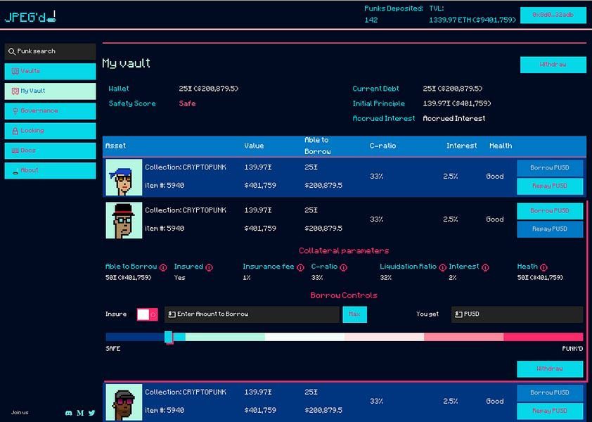In this way, you can think about JPEGād as akin to MakerDAO but for NFTs. Instead of opening up a collateralized debt position (or Maker Vault as theyāre called now) with ETH or ERC-20 collateral to draw out stablecoin loans, JPEGād users will be able to do so with NFTs starting first with CryptoPunks.