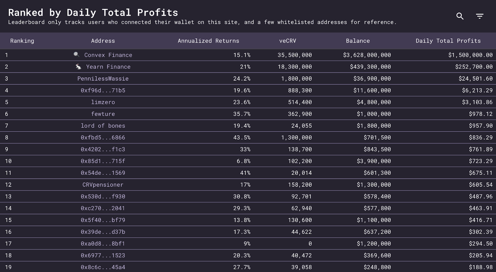 As we discussed earlier, 63% of the circulating CRV supply has been locked for veCRV. Of the 212 million veCRV, the two entities holding the most are Convex with 35.5 million (17.1% of the supply), and Yearn with 18.3 million (8.7% of the supply).