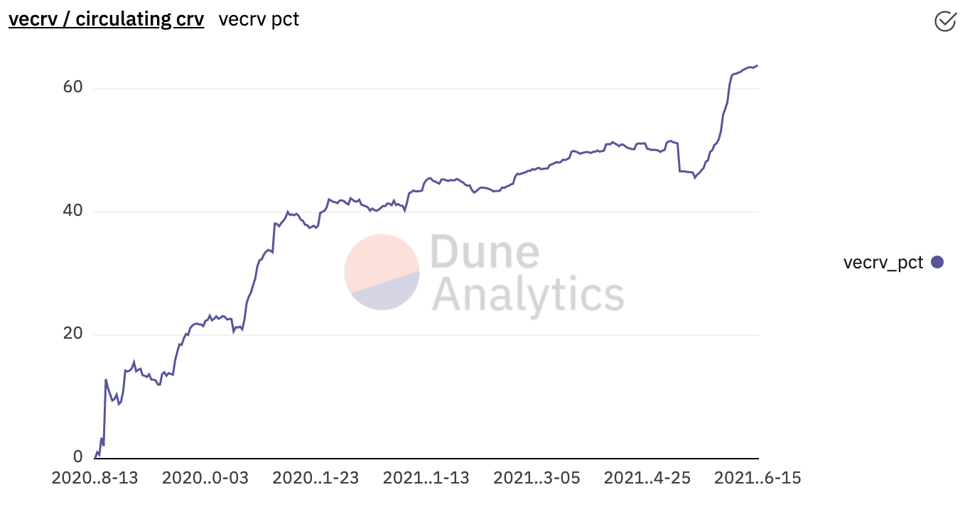 This has been the driving factor behind the sudden dramatic increase in the amount of CRV locked, with now over 63% of the supply taken out of circulation.