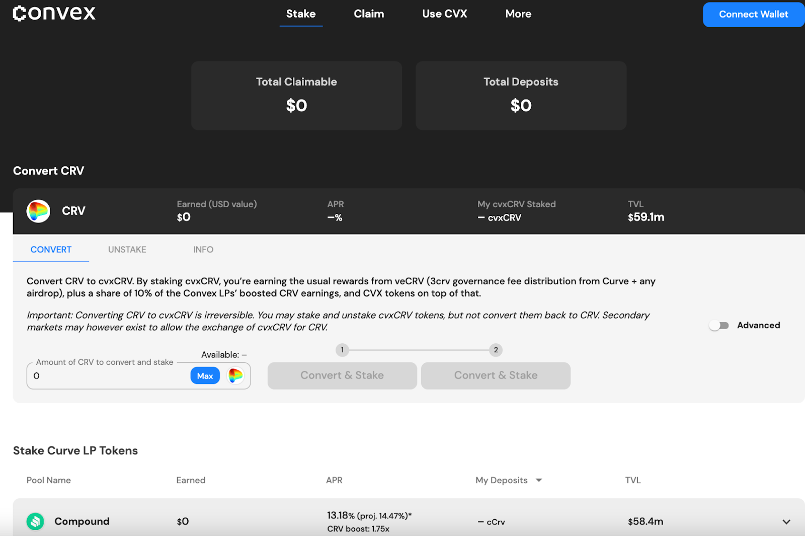 Like Yearn, Convex provides the ability for CRV holders to convert their holdings into a tokenized version of veCRV, cvxCRV (again, this cannot be undone).