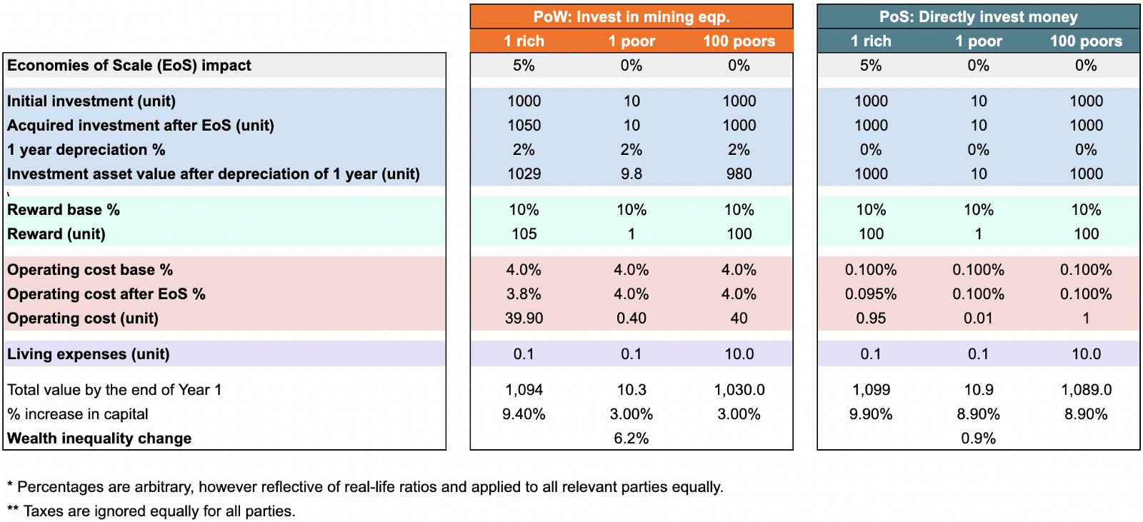 It turns out, the wealth gap between rich and poor operators in a PoW network increases much more than the wealth gap between rich and poor operators in a PoS network. Once we apply our assumptions to all sides accurately, the only distinction between PoW and PoS becomes the economies of scale.