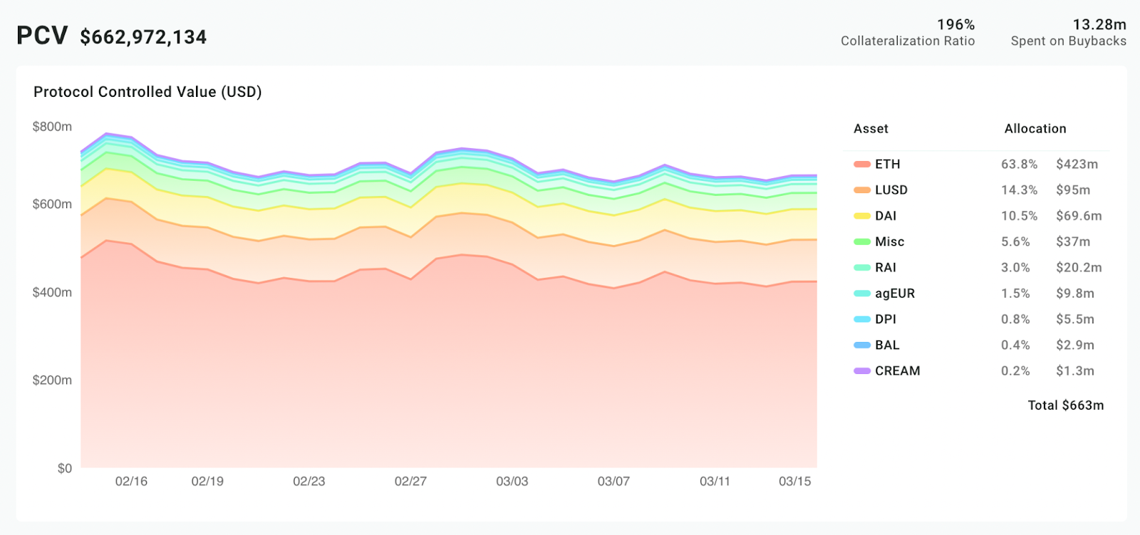 A key characteristic of the PCV is that it is made up entirely of decentralized assets, consisting of a mix of ETH, non-centralized stablecoins, and DeFi governance tokens.