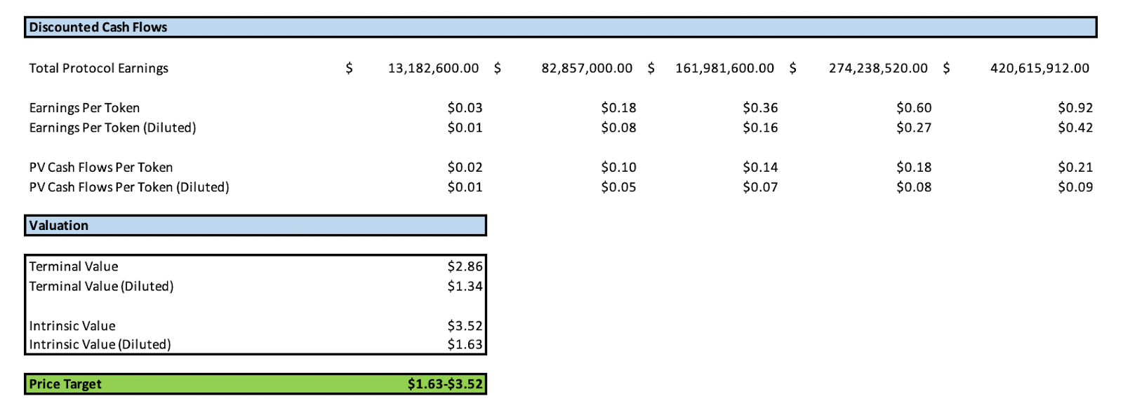 By summing the total cash flows generated by the two protocols and discounting them back to the present, we calculate that the fair value for TRIBE lies between $1.63-$3.52.