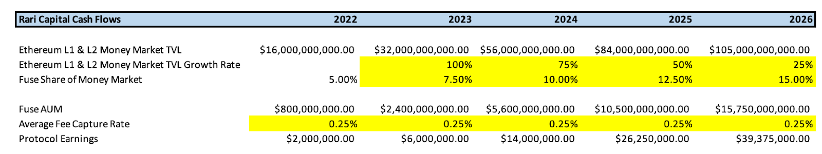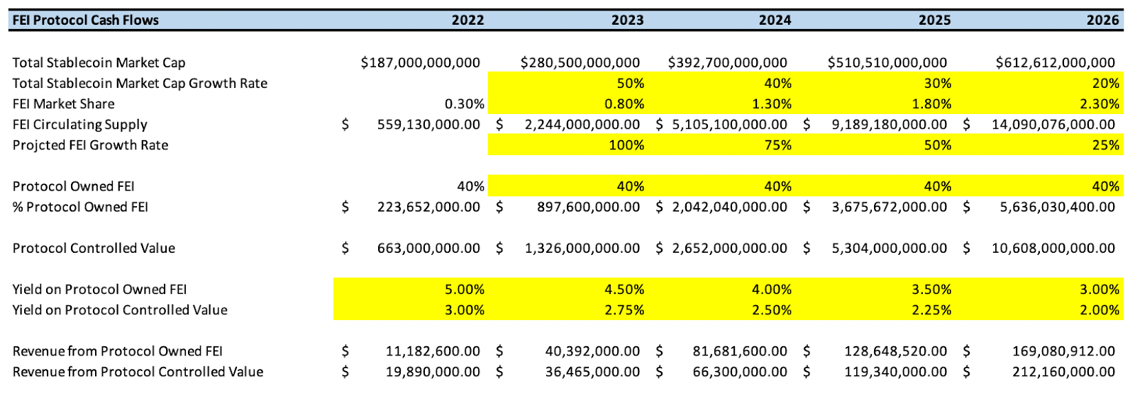 The model attempts to project the growth of both the FEI stablecoin and Fuse as a means of estimating the cash flows generated from each of these three sources.