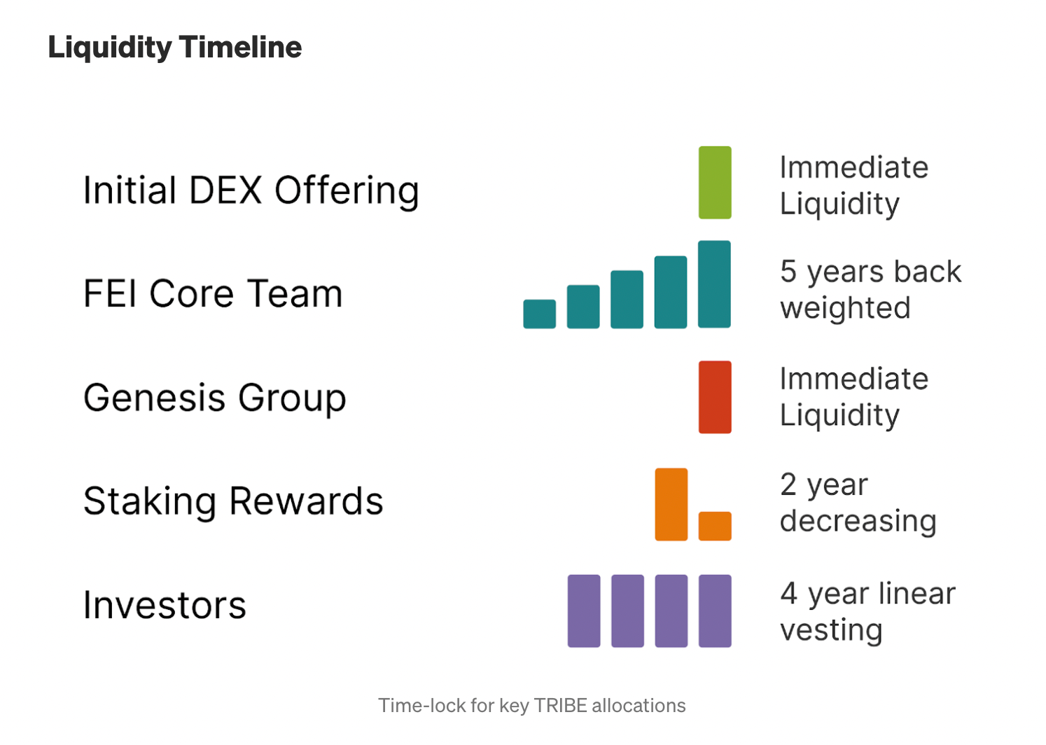 As we can see, the initial allocations for TRIBE are highly distributed, with just 18% going to the team and early investors. The allocation between these two groups is significantly lower than that of many other DeFi protocols, with genesis participants alone receiving a two times greater allocation than private-round investors.