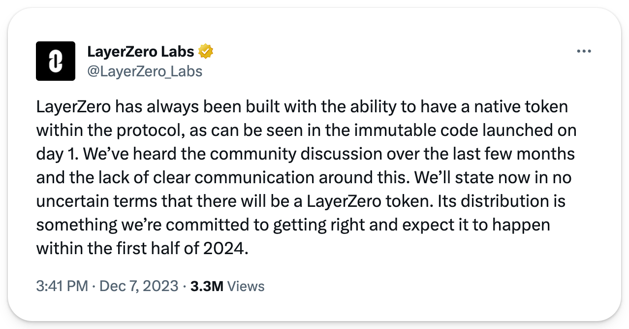 LayerZero, the blockchain interoperability protocol, officially announced plans to launch a native token in early 2024.