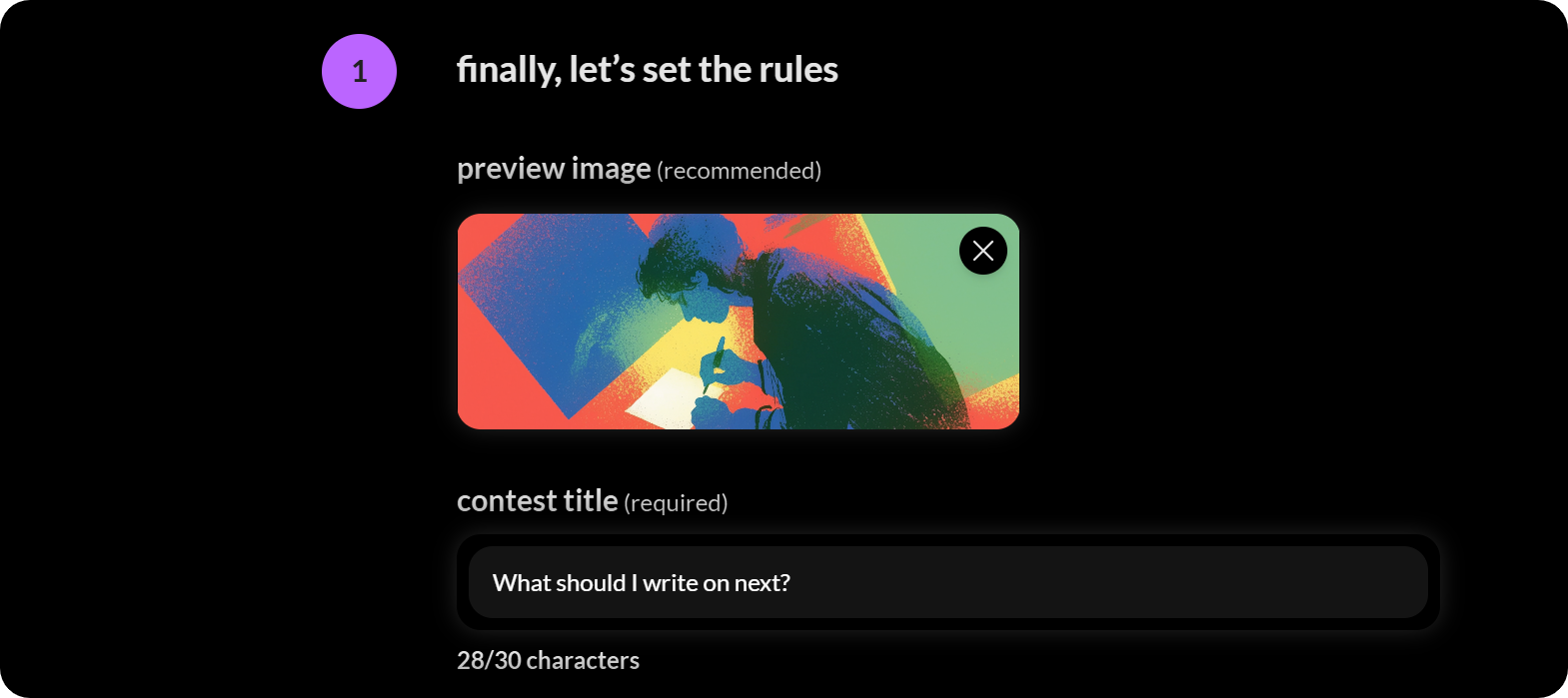 For instance, I'm testing a "What should I write on next?" contest, so I chose the leaderboard template. Whichever route you go, the ensuing interface will prompt you to finalize your contest details.