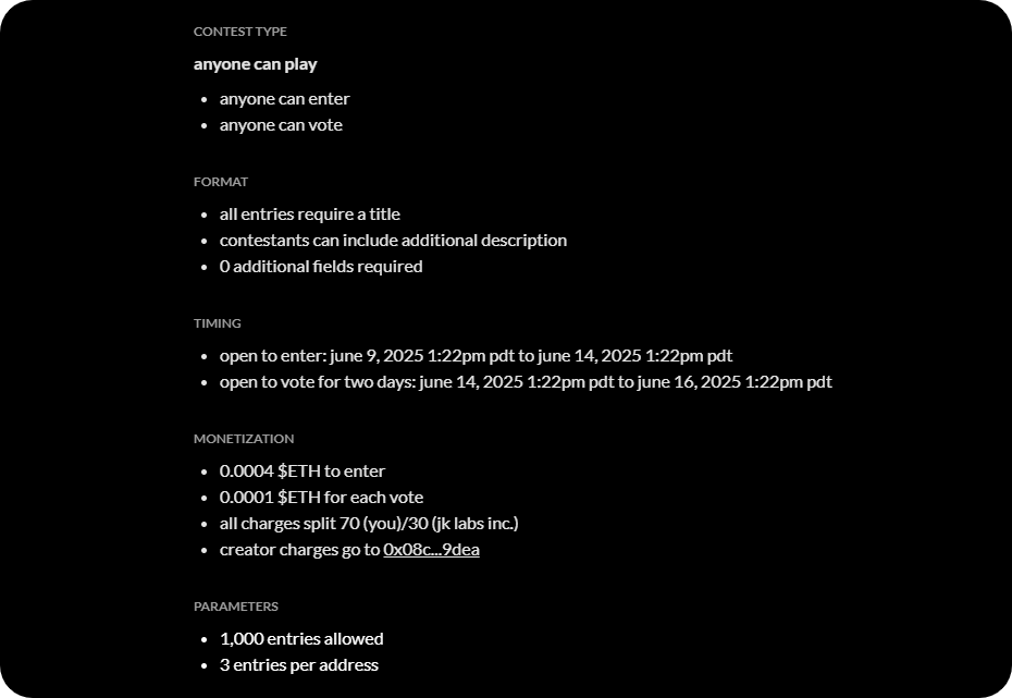 For my contest, I uploaded a preview image, set my title, summarized my contest and voter info, and then added my Farcaster profile as a point of contact for participants. You can also toggle into the "Advanced Settings" if you want to customize the total entries and entries per player allowed.