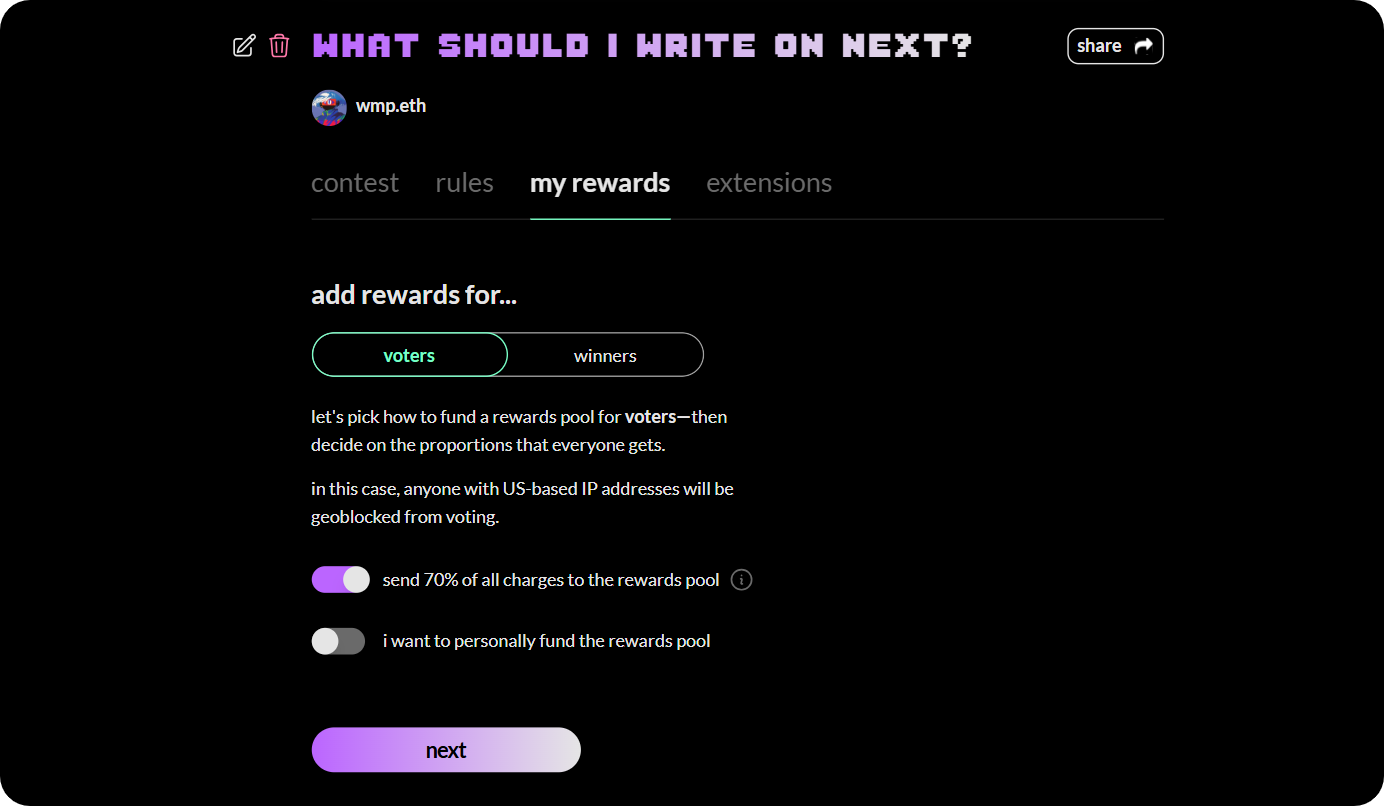 Now you'll immediately be greeted with the "My Rewards" dashboard where you can toggle on self-funding for your contest—just choose the "Send all charges to the rewards pool" option and press "Next."