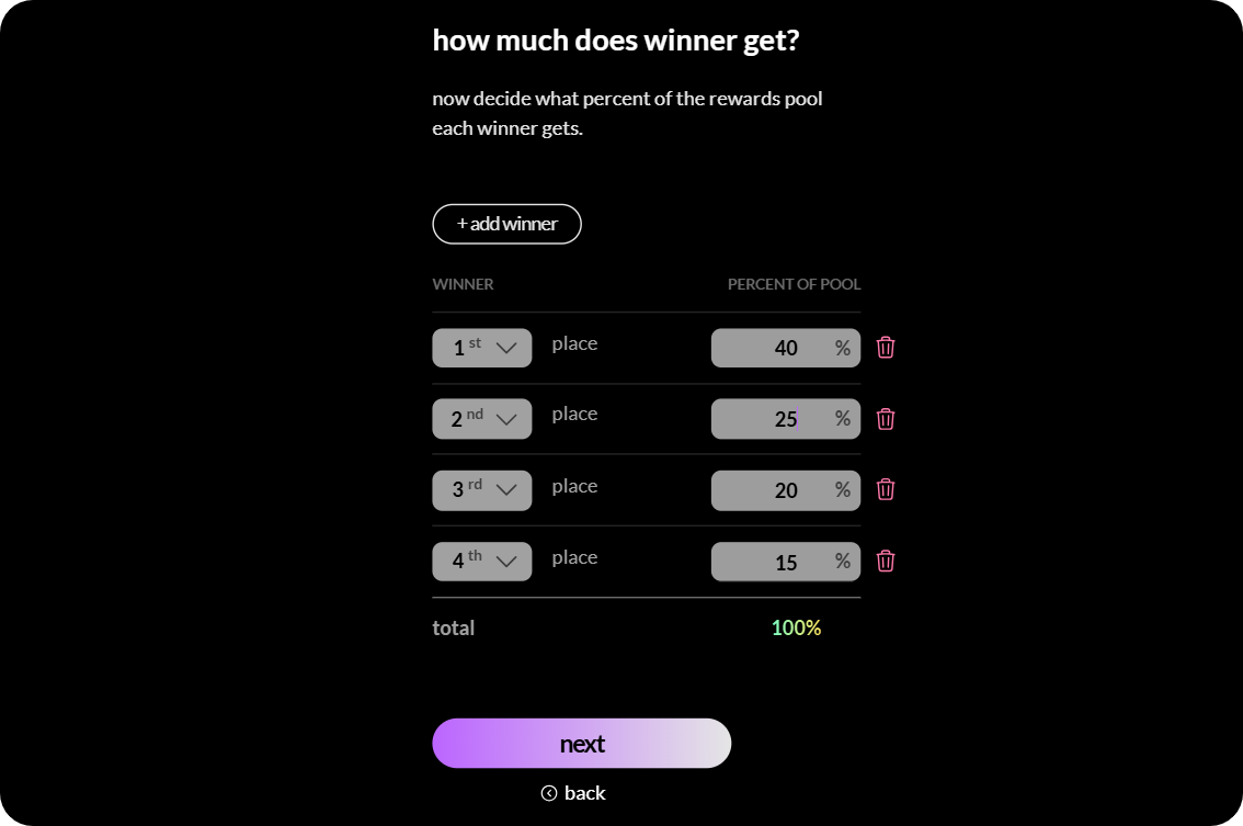 At this point, you'll be asked to configure your winner and rewards settings. I've set my contest up with 4 placement ranks and with 40% of accrued funding slated for the 1st place entry, but you have total flexibility here to customize your settings however you want.