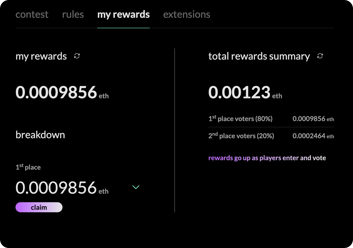 Doing this routes 70% of all the payments from votes into a prize pool. Voters buy votes for entries they like, and once the contest closes, the people who picked the winners (e.g. 1st, 2nd, 3rd, etc.) split the rewards pro-rata.