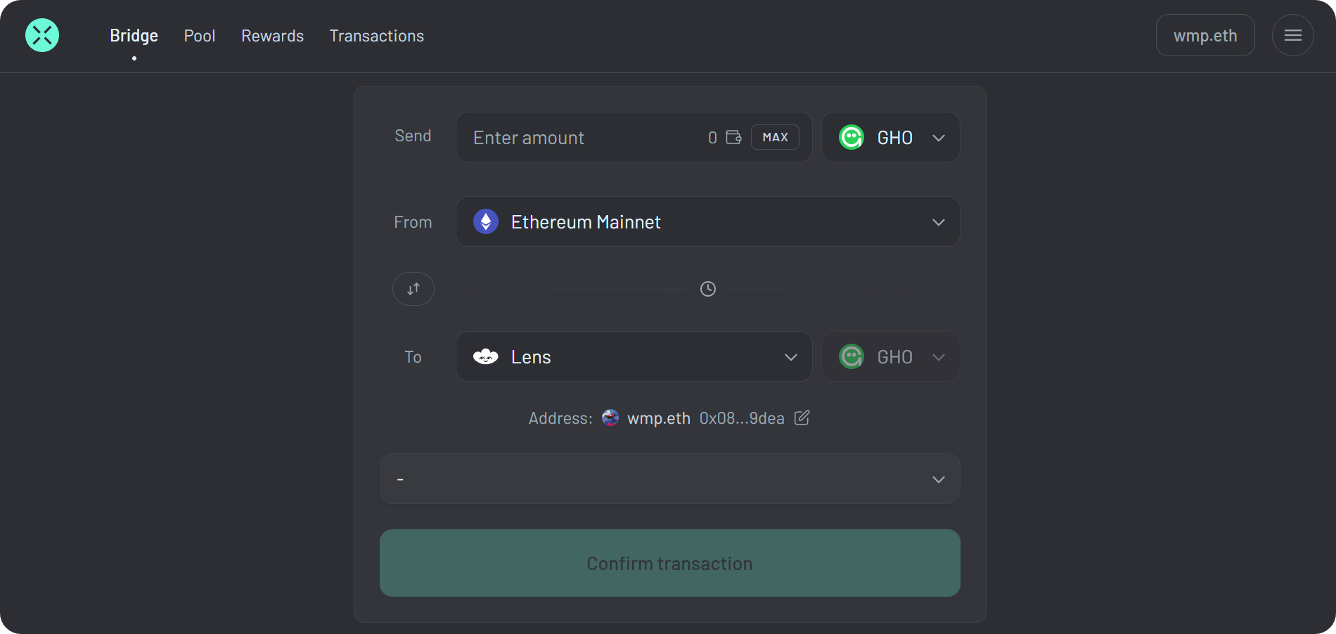 Either way, after you're done with your setup flow, you can acquire some GHO on Ethereum via Uniswap and bridge into Lens Chain using Across. It's also possible to bridge straight from ETH on Ethereum into GHO on Lens Chain using gas.zip.