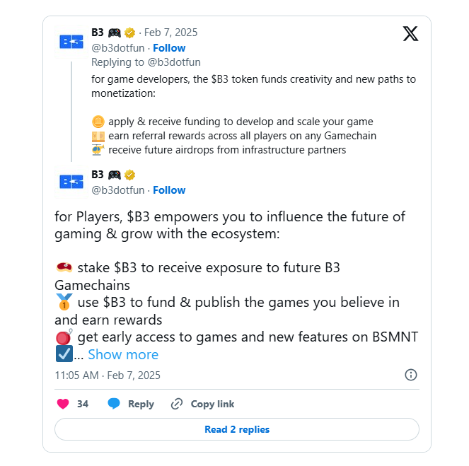 - B3 is also developing a rollup engine that will allow games in its ecosystem to create their own L3 Gamechains for greater customizability while still sharing an interconnected economy with the wider B3 ecosystem.