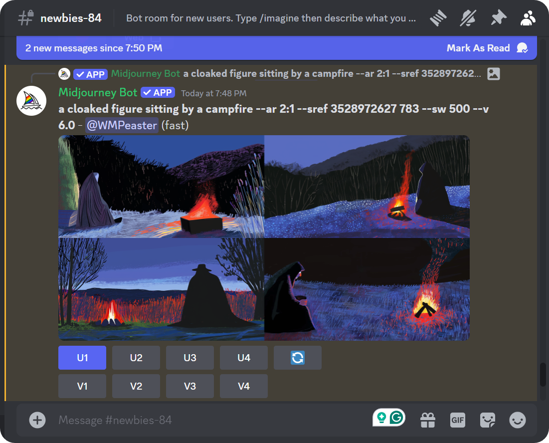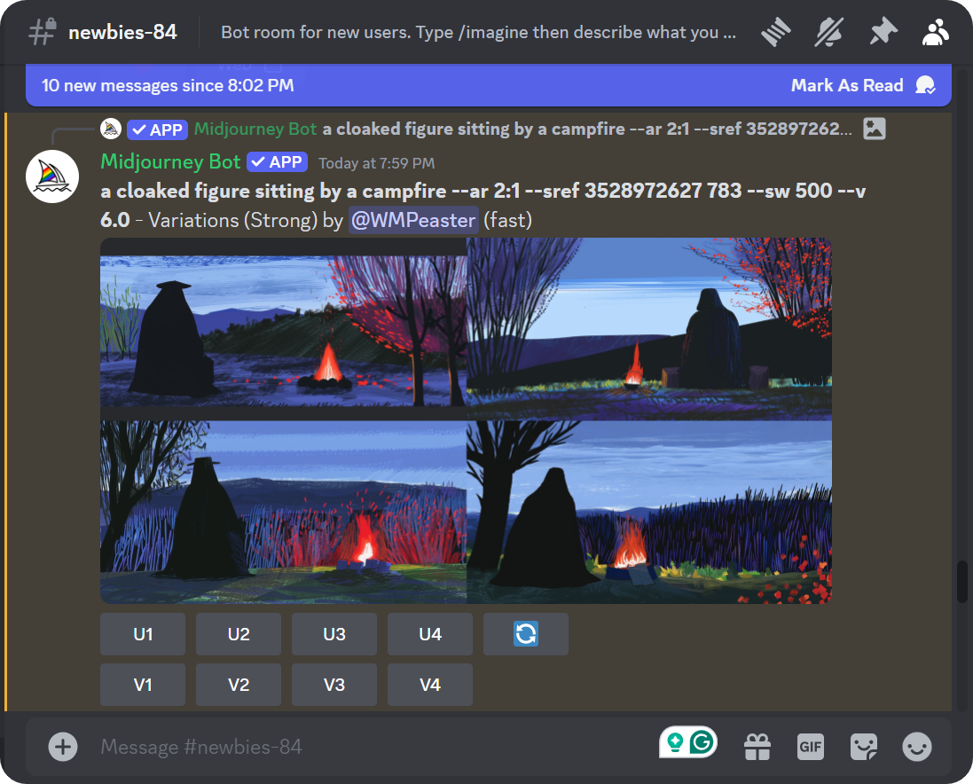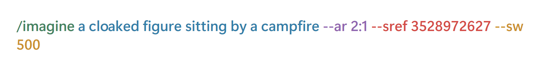 - 🔵 a cloaked figure sitting by a campfire — This second part is the beginning of your main prompt. These are the central visual instructions you give to Midjourney that will define your outputs. Get as visually descriptive here as you want, more details can lead to better results.