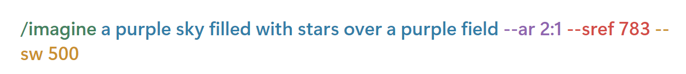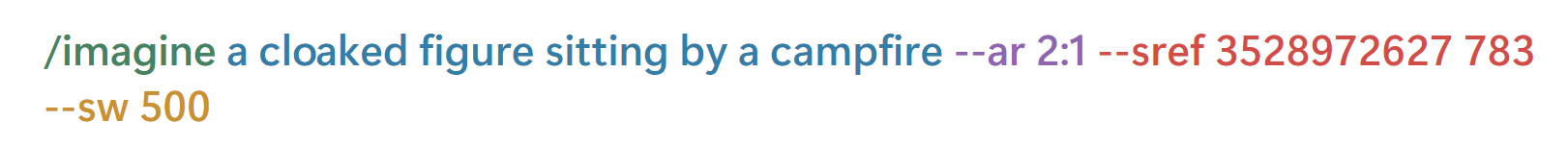 - 🟡 ––sw 500 — This is the style weight code. It's responsible for setting the strength of your sref code’s stylization, with possible inputs running from 0 to 1000. I typically go right in the middle here and leave this at 500, but it’s an avenue to tinker with if you want to experiment with your visuals.