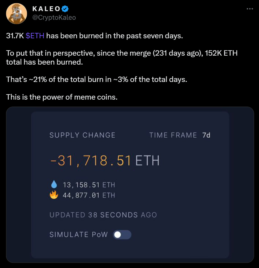 No kidding, amid the ongoing memecoin boom on Ethereum around 21% of the total ETH burned to date has come from over just the past seven days alone!