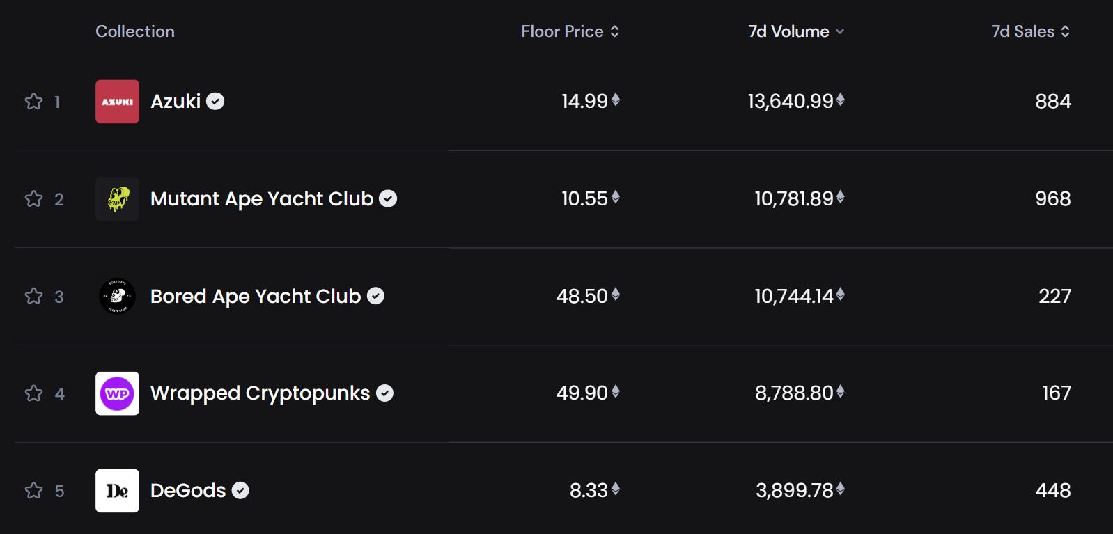 This week the market cap of NFTs dropped from 8.09 million ETH to 7.86 million ETH, or $14.93B USD, for a decline of nearly 3%. The outflow here’s hardly surprising considering how memecoins like $PEPE and $TURBO have been dominating the cryptoeconomy’s attention cycles — and trading action — in recent days.