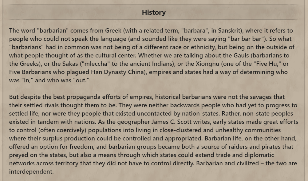 - The etymology of “barbarian” comes from ancient state insiders literally not understanding what their nomadic outsiders were saying/speaking. The outsiders weren’t dumb, they simply spoke a differerent language and lived per a drastically different (and freer) culture.