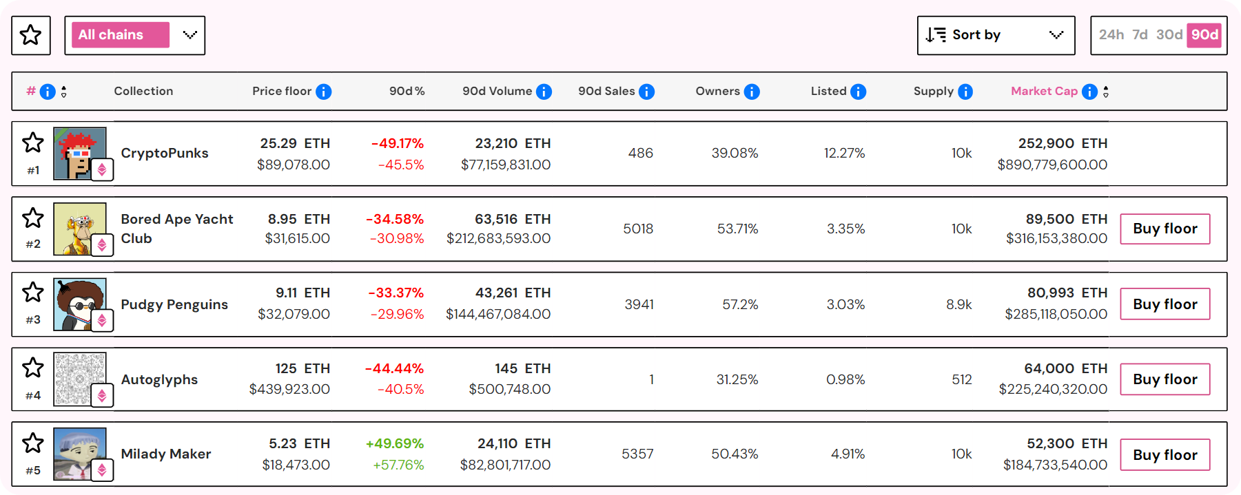 In this same span, CryptoPunks, Bored Apes, and Pudgy Penguins saw their floor prices drop 49%, 35%, and 33% respectively!